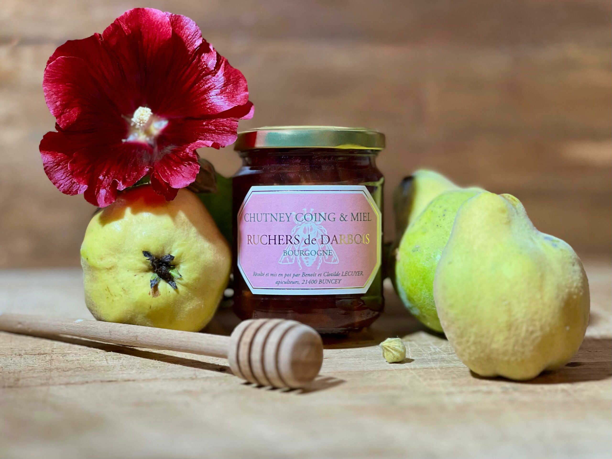 Ce chutney est élaboré avec du coing et avec le miel des Ruchers de Darbois. Le chutney est un condiment aigre doux épicé, sucré salé.